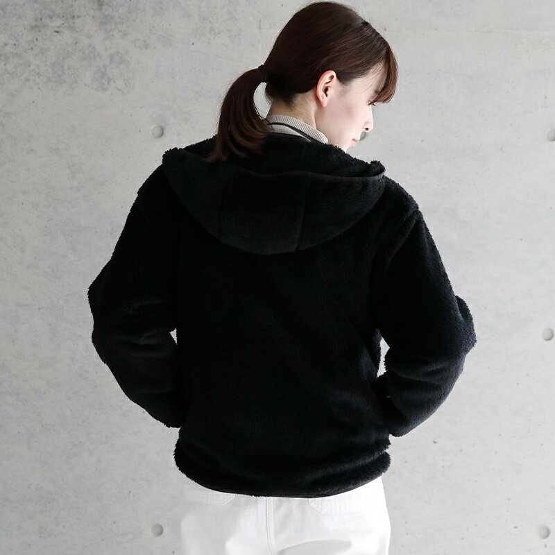 保温性と速乾性に優れた、ポリエステル100%のフリース素材が使用され、ふっくらとした軽やかな質感で着心地の良さを実感できます。