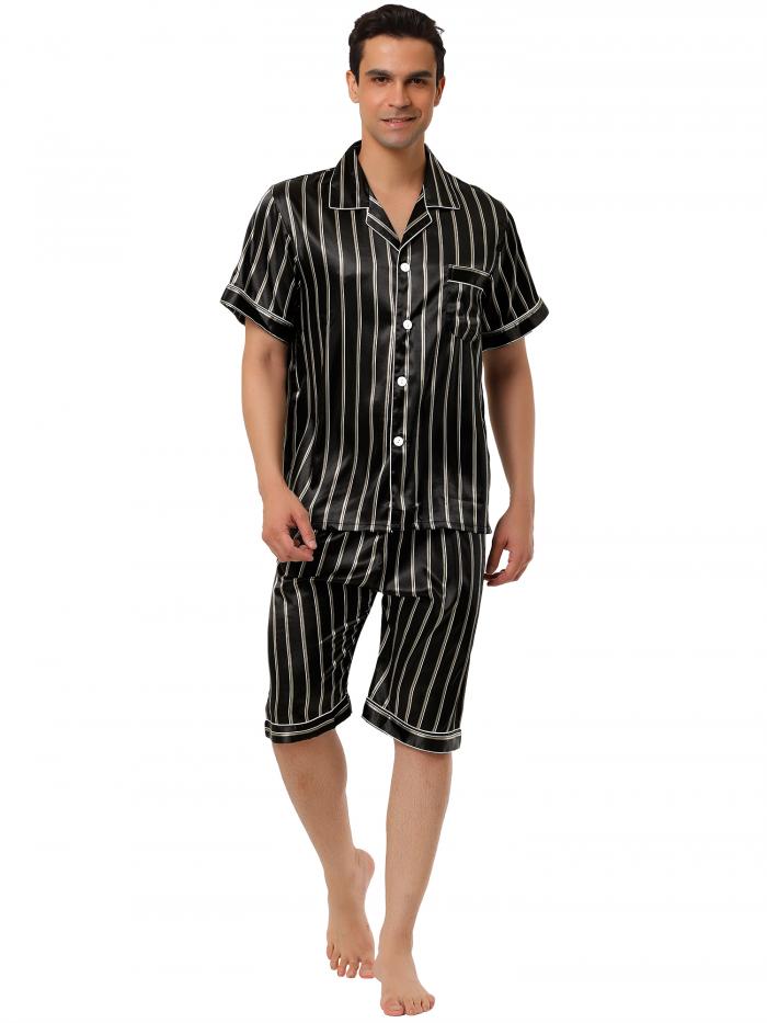 Lars Amadeus 縦 ストライプ柄 サテン パジャマ 上下セット 夏 半袖 ボタンダウン メンズ ブラックホワイト L