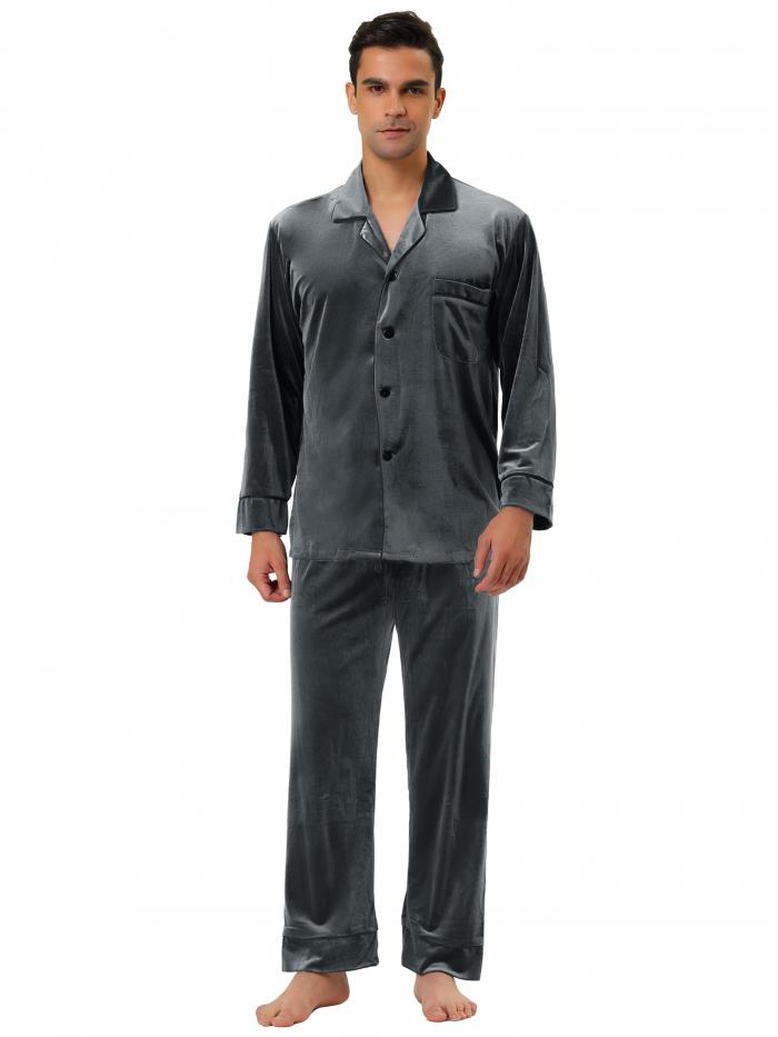 Lars Amadeus メンズ ベルベット パジャマ 上下セット 無地 長袖 ボタンダウン カジュアル グレー L