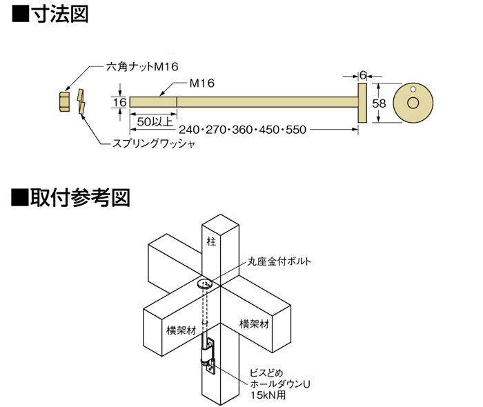 オメガー ホールダウン 丸座金付ボルト M16×550mm AF4L26 20本単位 最近ではプレカットなど上棟木材と一緒に金物も納品さえれるケースが殆どでしょうが 数量が足りなかった… 増改築で必要になった… 手きざみ現場で不意に必要になったり…と 多少は手元に持っておきたい建築木造住宅の金物では? 設計図書に合わせてしっかりとした木造住宅を… ■性能試験済: 性能試験済金物とは 第三者機関において 規定された試験・評価方法に従って学識経験者及び熟練した専門の技術者が性能を確認し その証として評価文書が発行された金物を指します 当社の性能試験金物は 一般財団法人建材試験センター ハウスプラス確認検査株式会社 公益財団法人日本住宅・木材技術センターにおいて性能評価を受けておりますので 用途・耐力値の範囲内で安心してご使用ください 短期基準耐力:17.3kN 用途・特長 柱と横架材の接合の際、ホールダウン金物とセットで使用します 1:直径60mmの座掘りで取り付けが可能です ※丸座金付ボルトは 短期基準耐力の範囲内で使用してください ■サイズ:M16×550mm ■商品コード:AF4L2611 ■材質: 丸座部:JIS G 3131(熱間圧延軟鋼板及び鋼帯)SPHC相当 ボルト部:JIS B 1180及びJIS B 1051(強度区分4.6を満足する炭素鋼)相当 ■表面処理:JIS H 8610(電気亜鉛めっき)及び JIS H 8625 Ep-Fe/Zn8/CM2 C ■付属金物:六角ナットM16スプリングワッシャ(各20個) ■重量(kg/ケース): 20.0kg ■商品コード:AF4L2611 ■メーカー:株式会社タナカ住宅資材 ■販売単位:20本入り1ケース単位 ■配送・納品: 基本弊社より出荷させて頂きます 在庫が確保できている場合は営業日の午前9時までにご注文頂けますと当日出荷させて頂きます ※在庫が無い場合は除きます ※お急ぎの場合はお問い合わせ(メール・お電話)下さい (947-960)【 関連製品 】 ■丸座金付ボルト M16×240mm AF4L25 20本単位 ■丸座金付ボルト M16×270mm AF4L00 20本単位 ■丸座金付ボルト M16×360mm AF4L36 20本単位 ■丸座金付ボルト M16×450mm AF4L45 20本単位 ■丸座金付ボルト M16×550mm AF4L26 20本単位