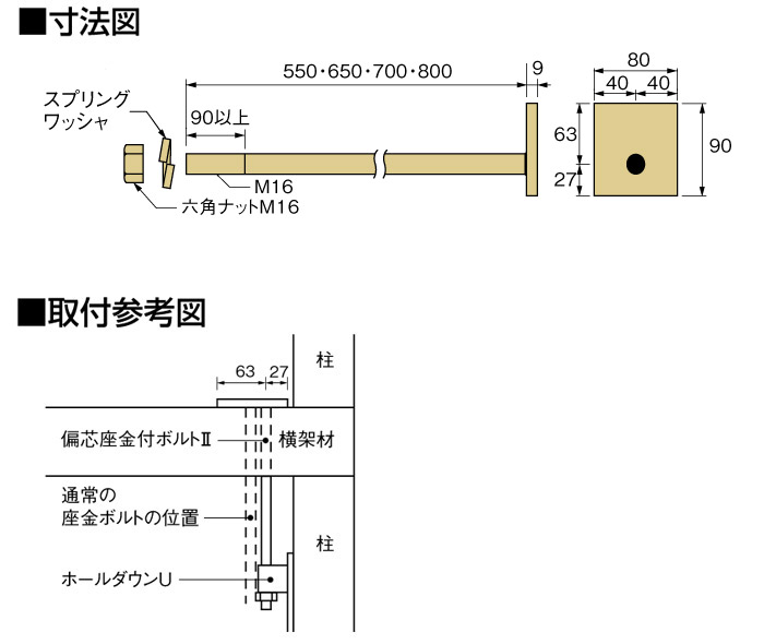 オメガー ホールダウン 偏心座金付ボルト2 M16×550mm AF5H55 10本単位 最近ではプレカットなど上棟木材と一緒に金物も納品さえれるケースが殆どでしょうが 数量が足りなかった… 増改築で必要になった… 手きざみ現場で不意に必要になったり…と 多少は手元に持っておきたい建築木造住宅の金物では? 設計図書に合わせてしっかりとした木造住宅を… ■めり込み耐力 すぎ類:28.8kN ひのき類:37.4kN べいまつ類:43.2kN 参考文献・法令・規格 平成13年国土交通省告示1024号 第1第一号 平成13年国土交通省告示1024号 第3第一号 木造軸組工法住宅の許容応力度設計(2008年版) (公財・日本住宅・木材技術センター発行) 用途・特長 柱と横架材の接合の際 ホールダウン金物とセットで使用します 1:座金部の大きさを80×90mmにすることで43.2kN(べいまつ類時)のめり込み耐力を確保しました ※めり込み耐力については 別途計算書を用意しております ■サイズ:M16×550mm ■材質: 座金部:JIS G 3131(熱間圧延軟鋼板及び鋼帯)SPHC相当 ボルト部:JIS B 1180及びJIS B 1051(強度区分4.8を満足する炭素鋼)相当 ■表面処理:JIS H 8610(電気亜鉛めっき)及び JIS H 8625 Ep-Fe/Zn8/CM2 C ■付属金物:六角ナットM16スプリングワッシャ(各10個) ■重量(kg/ケース): 14.2kg ■商品コード:AF5H5511 ■メーカー:株式会社タナカ住宅資材 ■販売単位:10本入り1ケース単位 ■配送・納品: 基本弊社より出荷させて頂きます 在庫が確保できている場合は営業日の午前9時までにご注文頂けますと当日出荷させて頂きます ※在庫が無い場合は除きます ※お急ぎの場合はお問い合わせ(メール・お電話)下さい (947-952)【 関連製品 】 ■偏心座金付ボルト2 M16×550mm AF5H55 10本単位 ■偏心座金付ボルト2 M16×650mm AF5H65 10本単位 ■偏心座金付ボルト2 M16×700mm AF5H70 10本単位 ■偏心座金付ボルト2 M16×800mm AF5H80 10本単位