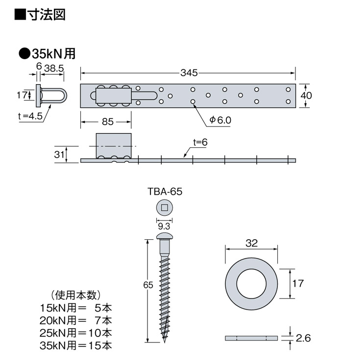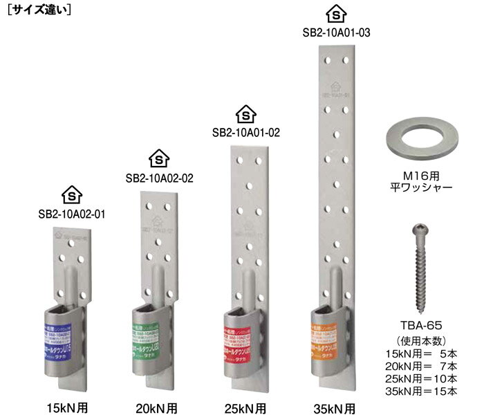 オメガー ビスどめホールダウンU 35kN用 U字型ホールのクリアランスにより使い易くカラーシールで耐力確認が 一目でわかる定番のビスどめホールダウン金物です ■ビスどめホールダウンU15kN用及び20kN用は 本体下部の巾が30mmと細くなっているため 筋かいまたは筋かい金物との干渉を最小限に抑えられます ■ビスどめホールダウンU25kN用は Zマーク表示金物(S-HD)に比べてコンパクトな設計ですので 10kNから25kNの引き抜き耐力が必要な柱にこれ1種類で使用することも可能です 最近ではプレカットなど上棟木材と一緒に金物も納品さえれるケースが殆どでしょうが 数量が足りなかった… 増改築で必要になった… 手きざみ現場で不意に必要になったり…と 多少は手元に持っておきたい建築木造住宅の金物では? 設計図書に合わせてしっかりとした木造住宅を… ■告示1460号第二号(ぬ) ■N値6.6以下 ■性能認定品: SB2-10A01-03 性能認定金物とは 公益財団法人日本住宅・木材技術センターの規格金物(Zマーク表示金物 Cマーク表示金物等)以外の 金物及び防せい防食処理について その用途に応じて必要とする品質・性能を有することを確認し その性能値を認定すると同時に その証として認定書が発行された金物を指します 公益財団法人日本住宅・木材技術センターの認定金物ですので 用途・耐力値の範囲内で安心してご使用ください 用途・特長 基礎と柱脚の緊結 柱と横架材の緊結 上下階の柱相互の緊結に使用します 1:U字型ホールのクリアランスと 角ビットビスの使用で施工が容易になりました 2:柱にとめ付けるビスがセットされており 従来必要であったボルトや座金が不要となりますのでコスト削減が図れます 3:ボルト孔加工や座掘り加工が不要となったため 柱の欠損から生じる構造躯体の弱体化を防ぎます 4:公財・日本住宅・木材技術センターによる性能認定品です 施工方法 1:本体のU字型ホールにアンカーボルトまたは縦ボルトを通し U字型ホール上部からナットの締め代25mm程度を出すように位置を合わせます 2:専用角ビットビスTBA-65を規定本数でとめ付けてください 3:アンカーボルトまたは縦ボルトに 付属の平ワッシャーを通しナットで締め付けてください ※専用角ビットビスTBA-65の締め付けには、3番四角ビット(別売品)をご使用ください 注意事項 ●指定の用途以外には使用しないでください ●けが防止のため手袋等をはめて作業を行ってください ●柱にパネル枠材(30mm厚以下)を介する場合は 「枠材用ビスどめホールダウンU」をご使用ください ●枠組壁工法には 「2×4用ビスどめホールダウンU」をご使用ください ■サイズ:40×345×6.0(t) ■材質:JIS G 3131(熱間圧延軟鋼板及び鋼帯)SPHC ■表面処理:エコートWH処理 「エコートWH処理」は NOFメタルコーティングス(株)の登録商標です ■付属金物:専用角ビットビスTBA-65(375本)M16用平ワッシャー(25枚) ■重量(kg/ケース):23.3kg ■商品コード:AF434600 ■メーカー:株式会社タナカ住宅資材 ■販売単位:25個入り1ケース単位 ■配送・納品: 基本弊社より出荷させて頂きます 在庫が確保できている場合は営業日の午前9時までにご注文頂けますと当日出荷させて頂きます ※在庫が無い場合は除きます ※お急ぎの場合はお問い合わせ(メール・お電話)下さい (947-943) 管柱の片引きには 偏芯座金付ボルト2が便利です 上下階の管柱の連結には 同じ耐力のホールダウン金物をお使いください 横架材面から金物までの寸法(締め代)は30mm以上確保してください その他仕様・使用方法・アンカーの埋込深さなども十分に確認してください【 関連製品 】 ■ビスどめホールダウンU 15kN用 AF4046 30個単位 ■ビスどめホールダウンU 20kN用 AF4146 30個単位 ■ビスどめホールダウンU 25kN用 AF4246 25個単位 ■ビスどめホールダウンU 35kN用 AF4346 25個単位 ※専用角ビットビスTBA-65の締め付けには、3番四角ビット(別売品)をご使用ください > ※管柱の片引きには 偏芯座金付ボルト2が便利です ■偏心座金付ボルト2 M16×550mm AF5H55 10本単位 ■偏心座金付ボルト2 M16×650mm AF5H65 10本単位 ■偏心座金付ボルト2 M16×700mm AF5H70 10本単位 ■偏心座金付ボルト2 M16×800mm AF5H80 10本単位
