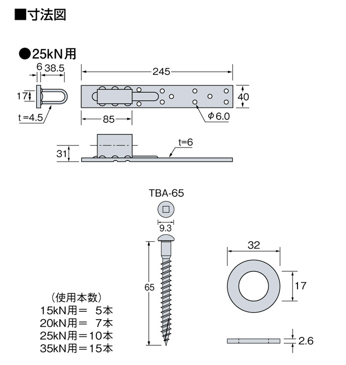 オメガー ビスどめホールダウンU 25kN用 U字型ホールのクリアランスにより使い易くカラーシールで耐力確認が 一目でわかる定番のビスどめホールダウン金物です ■ビスどめホールダウンU15kN用及び20kN用は 本体下部の巾が30mmと細くなっているため 筋かいまたは筋かい金物との干渉を最小限に抑えられます ■ビスどめホールダウンU25kN用は Zマーク表示金物(S-HD)に比べてコンパクトな設計ですので 10kNから25kNの引き抜き耐力が必要な柱にこれ1種類で使用することも可能です 最近ではプレカットなど上棟木材と一緒に金物も納品さえれるケースが殆どでしょうが 数量が足りなかった… 増改築で必要になった… 手きざみ現場で不意に必要になったり…と 多少は手元に持っておきたい建築木造住宅の金物では? 設計図書に合わせてしっかりとした木造住宅を… ■告示1460号第二号(り) ■N値5.4以下 ■性能認定品: SB2-10A01-02 性能認定金物とは 公益財団法人日本住宅・木材技術センターの規格金物(Zマーク表示金物 Cマーク表示金物等)以外の 金物及び防せい防食処理について その用途に応じて必要とする品質・性能を有することを確認し その性能値を認定すると同時に その証として認定書が発行された金物を指します 公益財団法人日本住宅・木材技術センターの認定金物ですので 用途・耐力値の範囲内で安心してご使用ください 用途・特長 基礎と柱脚の緊結 柱と横架材の緊結 上下階の柱相互の緊結に使用します 1:U字型ホールのクリアランスと 角ビットビスの使用で施工が容易になりました 2:柱にとめ付けるビスがセットされており 従来必要であったボルトや座金が不要となりますのでコスト削減が図れます 3:ボルト孔加工や座掘り加工が不要となったため 柱の欠損から生じる構造躯体の弱体化を防ぎます 4:公財・日本住宅・木材技術センターによる性能認定品です 施工方法 1:本体のU字型ホールにアンカーボルトまたは縦ボルトを通し U字型ホール上部からナットの締め代25mm程度を出すように位置を合わせます 2:専用角ビットビスTBA-65を規定本数でとめ付けてください 3:アンカーボルトまたは縦ボルトに 付属の平ワッシャーを通しナットで締め付けてください ※専用角ビットビスTBA-65の締め付けには、3番四角ビット(別売品)をご使用ください 注意事項 ●指定の用途以外には使用しないでください ●けが防止のため手袋等をはめて作業を行ってください ●柱にパネル枠材(30mm厚以下)を介する場合は 「枠材用ビスどめホールダウンU」をご使用ください ●枠組壁工法には 「2×4用ビスどめホールダウンU」をご使用ください ■サイズ:40×245×6.0(t) ■材質:JIS G 3131(熱間圧延軟鋼板及び鋼帯)SPHC ■表面処理:エコートWH処理 「エコートWH処理」は NOFメタルコーティングス(株)の登録商標です ■付属金物:専用角ビットビスTBA-65(250本)M16用平ワッシャー(25枚) ■重量(kg/ケース):18.3kg ■商品コード:AF424600 ■メーカー:株式会社タナカ住宅資材 ■販売単位:25個入り1ケース単位 ■配送・納品: 基本弊社より出荷させて頂きます 在庫が確保できている場合は営業日の午前9時までにご注文頂けますと当日出荷させて頂きます ※在庫が無い場合は除きます ※お急ぎの場合はお問い合わせ(メール・お電話)下さい (947-942) 管柱の片引きには 偏芯座金付ボルト2が便利です 上下階の管柱の連結には 同じ耐力のホールダウン金物をお使いください 横架材面から金物までの寸法(締め代)は30mm以上確保してください その他仕様・使用方法・アンカーの埋込深さなども十分に確認してください【 関連製品 】 ■ビスどめホールダウンU 15kN用 AF4046 30個単位 ■ビスどめホールダウンU 20kN用 AF4146 30個単位 ■ビスどめホールダウンU 25kN用 AF4246 25個単位 ■ビスどめホールダウンU 35kN用 AF4346 25個単位 ※専用角ビットビスTBA-65の締め付けには、3番四角ビット(別売品)をご使用ください > ※管柱の片引きには 偏芯座金付ボルト2が便利です ■偏心座金付ボルト2 M16×550mm AF5H55 10本単位 ■偏心座金付ボルト2 M16×650mm AF5H65 10本単位 ■偏心座金付ボルト2 M16×700mm AF5H70 10本単位 ■偏心座金付ボルト2 M16×800mm AF5H80 10本単位