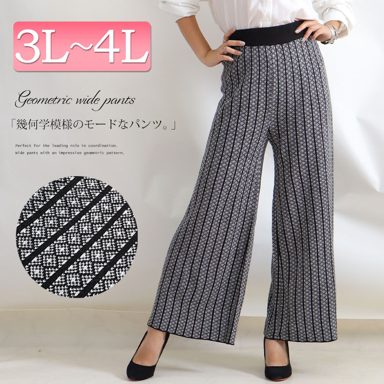 大きいサイズレディース ボトムス パンツ 幾何学柄ワイドパンツ ワイドパンツ ニットパンツ ストライプパンツ 幾何学柄 幾何学模様 ストライプ ヘリンボーン 秋新作 秋服 ルーム ストレッチ ワイド ガウチョ フレア 冬服 ウエストゴム 3L 4L 黒 ブラック 韓国ファッション