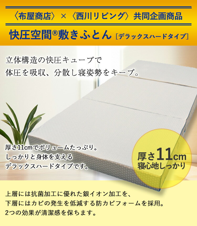 西川リビング 快圧空間敷きふとん (3つ折り)デラックスハードタイプ (2440-70199) WS ワイドシングル 11×97×200cm 【プレゼント付 】 立体キューブ ハード 日本製 敷布団 敷き布団 健康マットレス KAIATU 【ラッピング不可】【代引き不可】【受注生産】