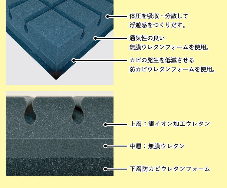◆上層には抗菌加工に優れた銀イオン加工を、下層にはカビの発生を低減する防カビフォームを採用。