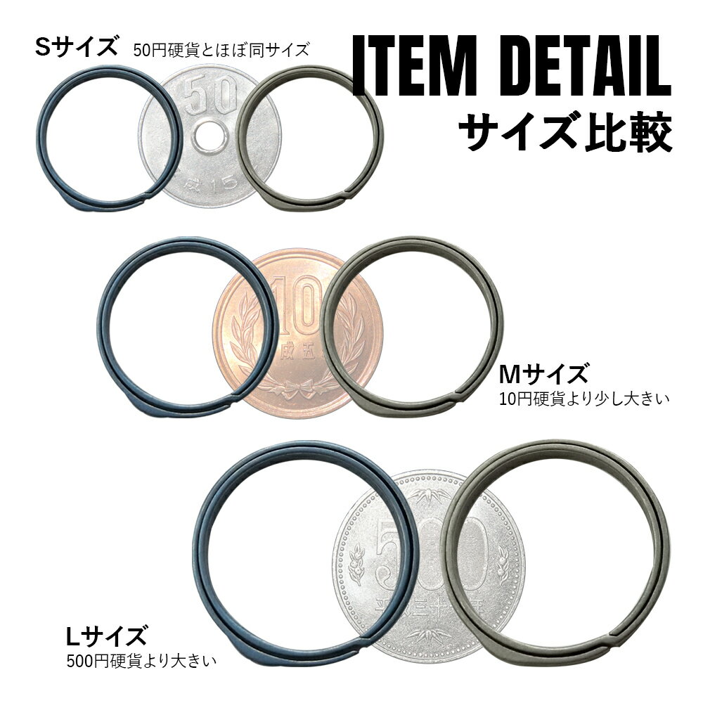 【商品詳細】 Mサイズ サイズ(約):26mm 内径(約):23mm 重量(約):1.5g Lサイズ サイズ(約):33mm 内径(約):28mm 重量(約):2g 材質:チタン 【セット内容】 Lサイズ×1、Mサイズ×4 【商品説明】 ■超軽量&頑丈!チタン製キーリング。