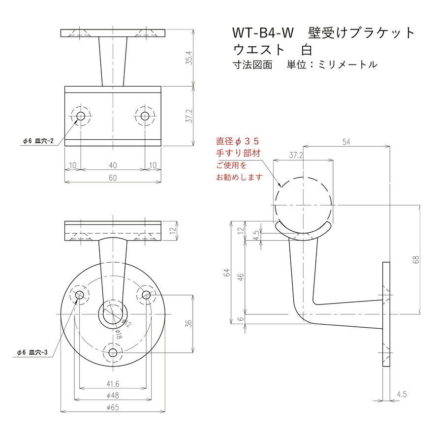 [WT-B4-W]サイズ(mm) W65×D72.6×H90.5 ※専用ビスが付属しております ※付属品:M5-L45皿ネジ(壁側)、M5-L15皿ネジ(手すり側) ※施工の注意点:下地木材厚み50mm要 ※表示価格には施工費は含まれておりません。