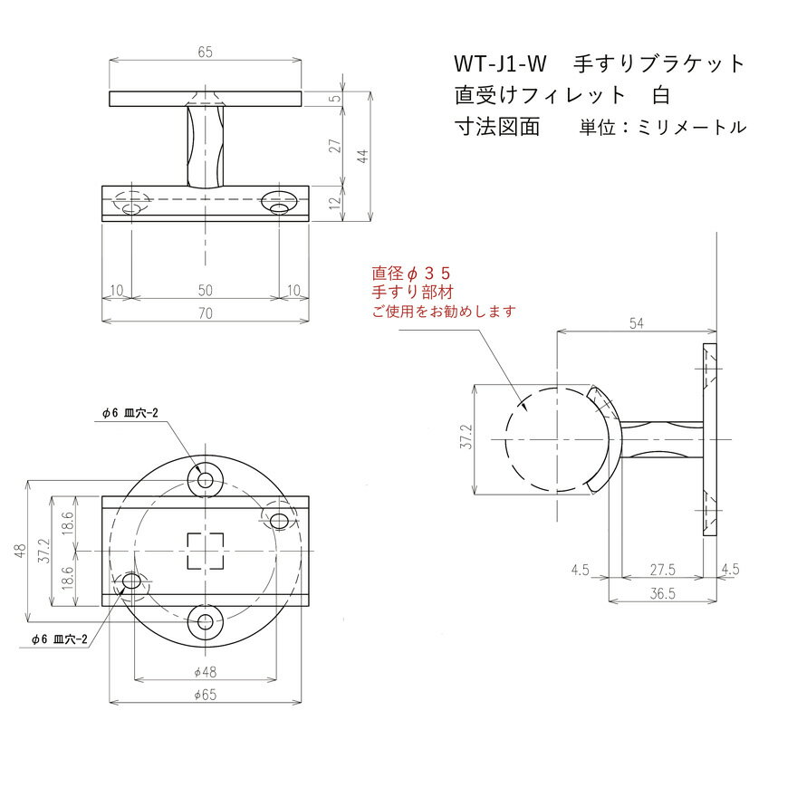 [WT-J1-W]サイズ(mm) W65×D44×H65 ※専用ビスが付属しております ※付属品:M5-L45皿ネジ(壁側)、M5-L15皿ネジ(手すり側) ※施工の注意点:下地木材厚み50mm要 ※表示価格には施工費は含まれておりません。