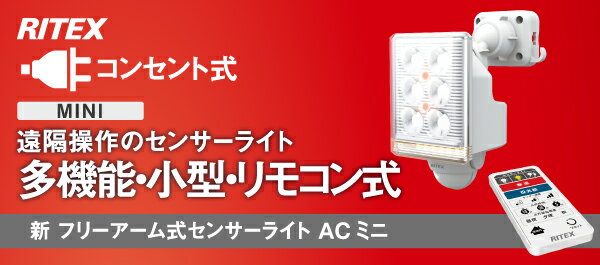 関連キーワード センサーライト 防犯灯 セキュリティ 防雨型 LEDライト 人感センサー LED SENSOR LIGHT 屋外灯 ガレージ 軒下灯 作業灯 庭 空き巣対策RITEX/ライテックスシリーズ フリーアーム式センサーライト AC ミニ 9W×1灯 ■特徴 多機能・小型・リモコン式 遠隔操作できるセンサーライト ・センサーライト(あかるい白色光・やさしい暖色光・白色光のちフラッシュ) ・強力な防犯(フラッシュ+ブザー) ・投光器としても ・24時間警戒灯 ・ほんのり常夜灯(4%) 取付け方法 1.はさむ(クランプが付属) 2.ネジで止める(付属) 3.磁石(別売)で吸着 4.バンド(別売)で巻く コンセント式なので電気工事は不要です。