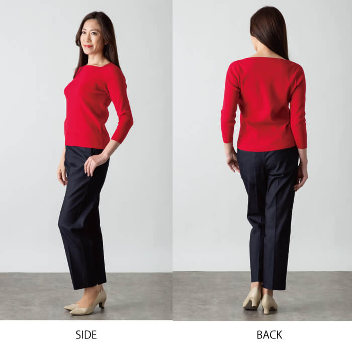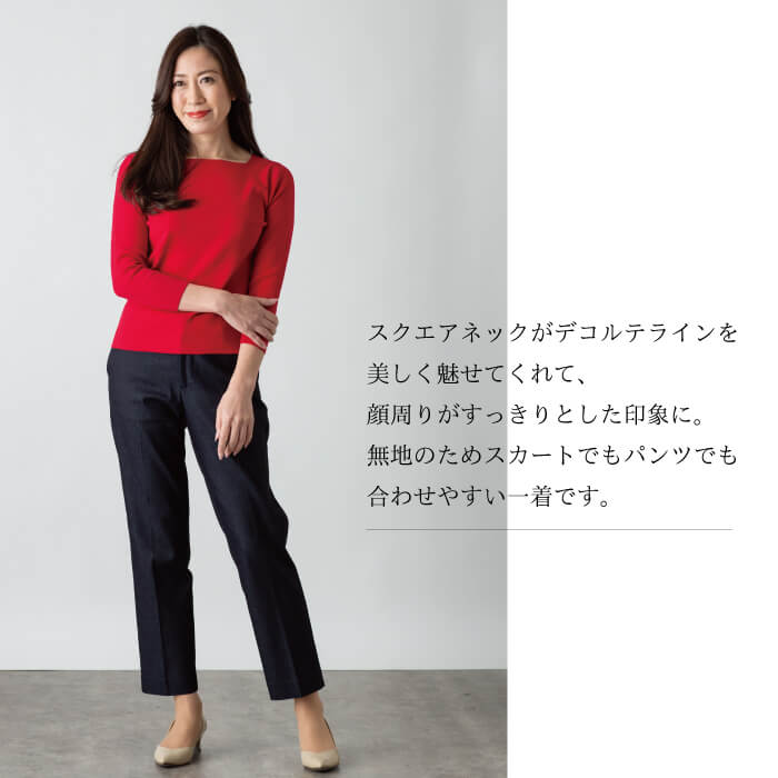 【送料無料】スクエアネックニットプルオーバー レディース トップス 七分袖 7分袖 春 秋 ニット PBT糸 形状安定性 ブラック レッド カーキ グレー 高性能ストレッチ素材 上品 キレイ目 カジュアル 着やせ 細見え スクエアネック デコルテ 美人ニット 大人