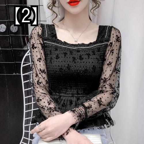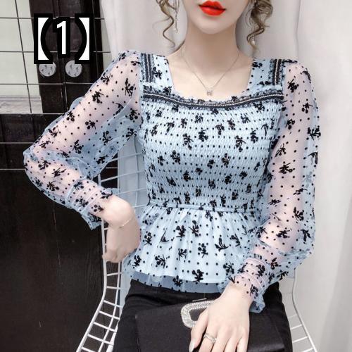 ペプラム トップス 長袖 夏 かわいい レディース ブラウス ショート丈 シフォン シースルー スクエアネック 花柄 青 黒
