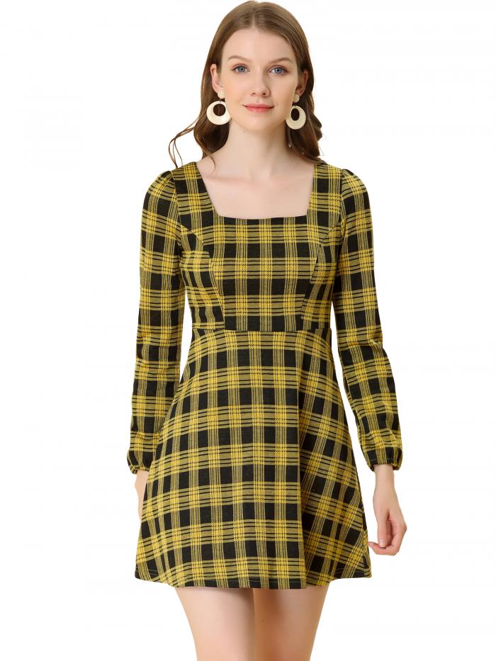 Allegra K チェックワンピース ドレス ミニ丈 スクエアネック レトロ 秋 レディース ブラックイエロー S