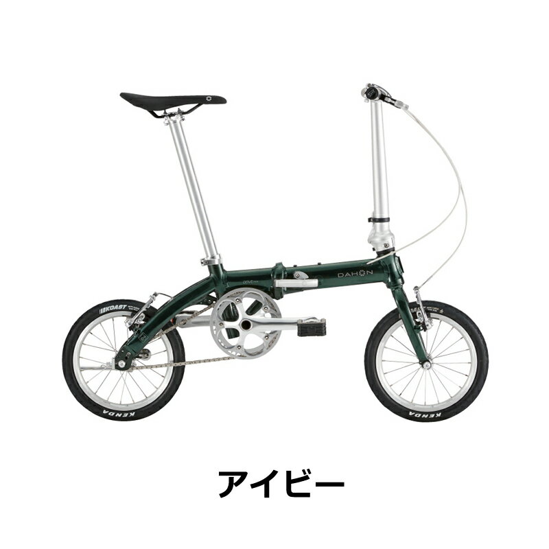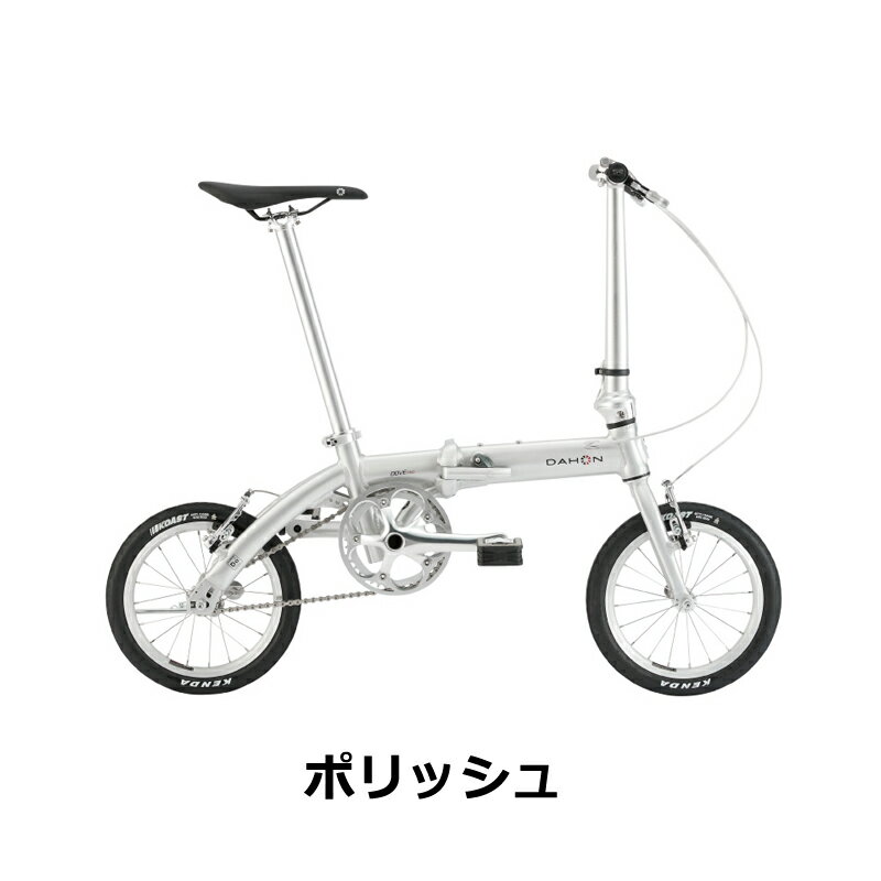 Folding Size (cm):W62 × H56 × D30カラー:ポリッシュ、アイビー適応身長:142~180cmスペック表ブランドDAHON(ダホン)年式2022年モデル車種・品名Dove Plus(ダヴ プラス) タイヤサイズ14×1.35フレームサイズシートチューブ長(メーカーサイズ)-トップチューブ長(ホリゾンタル)-適正身長目安142~180cm変速1speedペダルAluminum pedalスペックフレームDalloy Sonus Aluminum, Vice Grip technology, w/Luggage socketフォークDahon Slip Stream aluminum forkクランクセット42T, 170mm w/single chainguardBB純正FメカN/ARメカN/AシフターN/Aスプロケット9TブレーキレバーAvid FR5ブレーキTektro J310, Aluminum mini V brakeタイヤKenda K-1082, 14x1.35, F/Vホイールフロント:Dahon mini, 20H, OLD:74mmリア:Dahon mini, 20H, OLD:85mmハンドル純正ステムRadius onepiece post, leftside folding, 400mm/15°ヘッドセット純正サドル純正シートポストDahon Super Light aluminum, 33.9x530mm ※1.【商品に関して】商品説明文に特に記載がない限り、商品は写真に載っている物がすべてとなります。