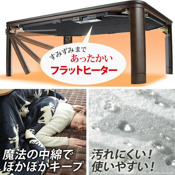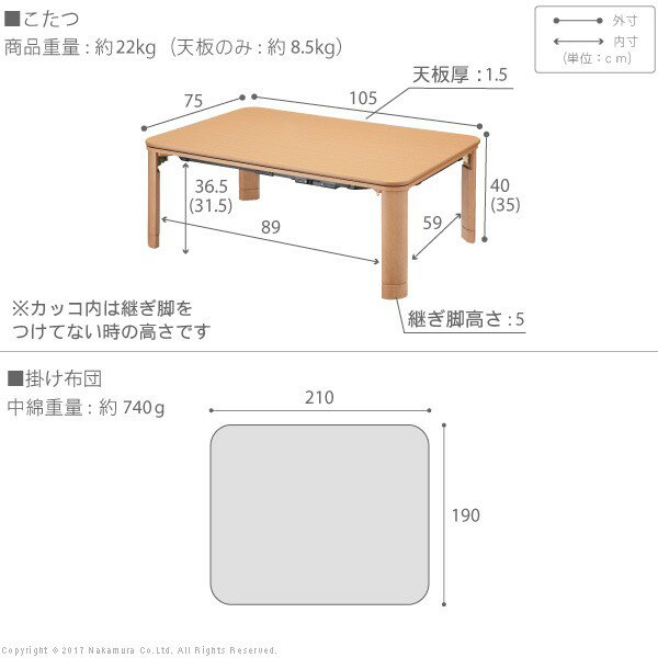 【セット構成】 こたつ本体x1 掛布団x1 【カラーバリエーション】 ■こたつ本体 ブラウン・ナチュラル ■掛布団 グレー・ネイビー 【仕様】 ■こたつ本体 天板:繊維板(木目転写) 脚部:天然木(ラバーウッド) フラットヒーター(300W、中間スイッチ式) ◎完成品 ■掛布団 表地:ポリエステル100%(フランネル) 裏地:ポリエステル100% 中綿:ポリエステル100%(ポリエステル綿68%・保温綿32%) 撥水・防汚加工 【サイズ】 ■こたつ本体 幅105x奥行75x高さ40cm 重量:約22kg 天板:幅105x奥行75cm・厚み15mm・約8.5kg 脚間:89/59cm 中天板下高さ:31.5/36.5cm 折り畳み高さ:11cm ■掛布団 210x190cm・中綿:約740g 株式会社ナカムラ(I-3302202)
