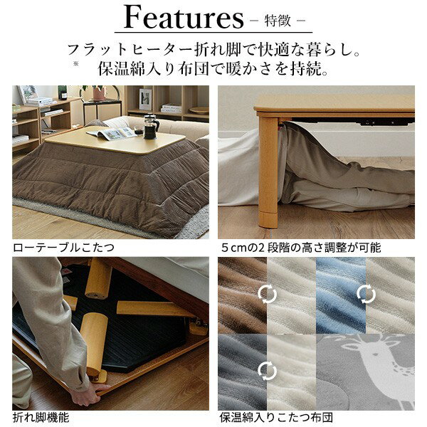 【セット構成】こたつ本体x1掛布団x1【カラーバリエーション】■こたつ本体ブラウン・ナチュラル■掛布団グレー・ネイビー【仕様】■こたつ本体天板:繊維板(木目転写)脚部:天然木(ラバーウッド)フラットヒーター(300W、中間スイッチ式)◎完成品■掛布団表地:ポリエステル100%(フランネル)裏地:ポリエステル100%中綿:ポリエステル100%(ポリエステル綿68%・サラウォーム保温綿32%)撥水・防汚加工【サイズ】■こたつ本体幅105x奥行75x高さ40cm重量:約22kg天板:幅105x奥行75cm・厚み15mm・約8.5kg脚間:89/59cm中天板下高さ:31.5/36.5cm折り畳み高さ:11cm■掛布団210x190cm・中綿:約740gこたつ 折りたたみ 長方形 フラットヒーター折れ脚こたつ 105x75cm+保温綿入り掛布団北欧柄 2点セット セット 布団 コタツ テーブル リビングテーブル 座卓 ローテーブル 節電 継ぎ足 省エネ 折れ脚 北欧 こたつカラー:ブラウン/布団:グレー※入荷状況により、発送日が遅れる場合がございます。