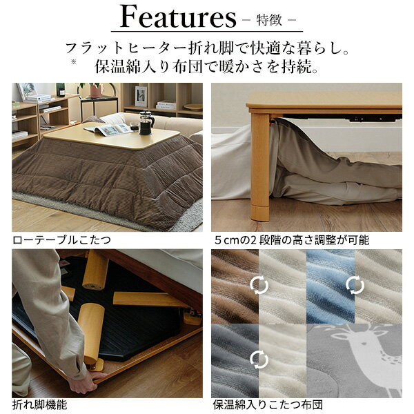 こたつ テーブル 折りたたみ フラットヒーター折れ脚こたつ-フラットモリス 105x75cm 保温綿入りはっ水こたつ布団エルク柄 2点セット 長方形 おしゃれ コタツ 炬燵 フラットヒーター リビング ローテーブル 節電 高さ調節 継ぎ足 北欧 木製 木目 テレワーク リモート 在宅