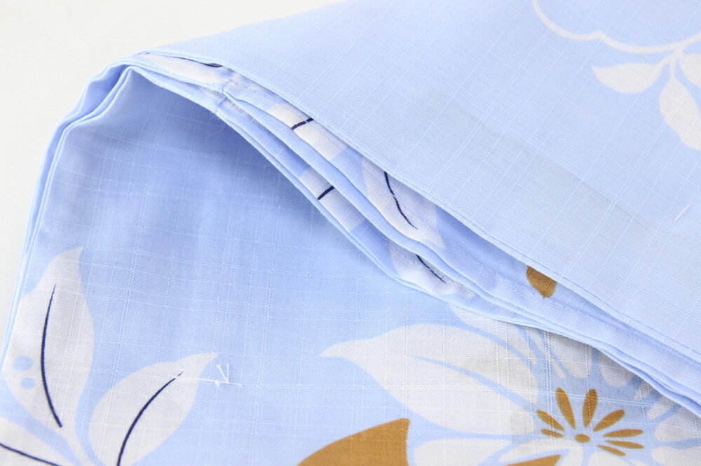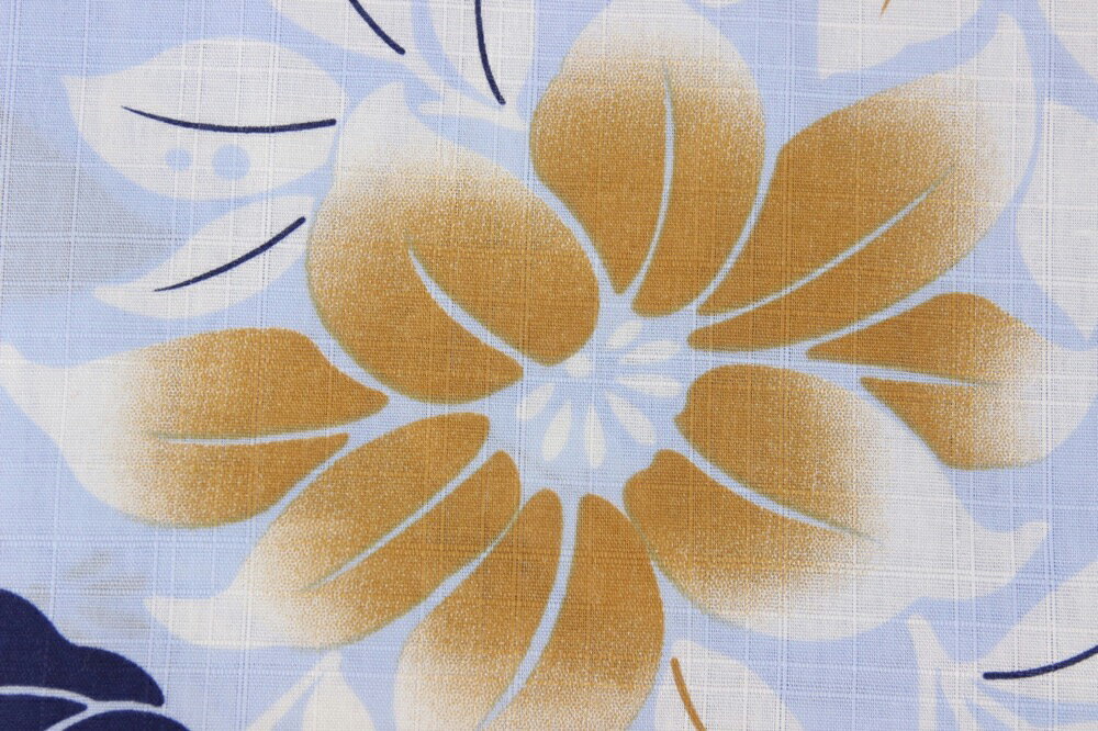 サイズ 身丈:約163cm 袖丈:約49cm 裄丈:約68cm 適応ヒップ:116cm位まで 色 水色×白×茶(花) 素材 綿100% ご注意 ・新しいうちは摩擦や汗等で下着や帯に色移りする事があります。