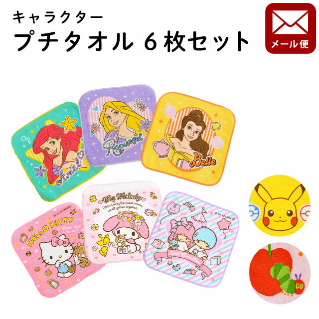 【メール便・送料込み】柄違い6枚セット プチタオル キャラクター ミニタオル 約16×16cm プリンセス&サンリオ はらぺこあおむし&ポケモン ラプンツェル アリエル ベル キティ マイメロディ キキララ ピカチュウ イーブイ 6枚組 入園準備 保育園【プチギフト】