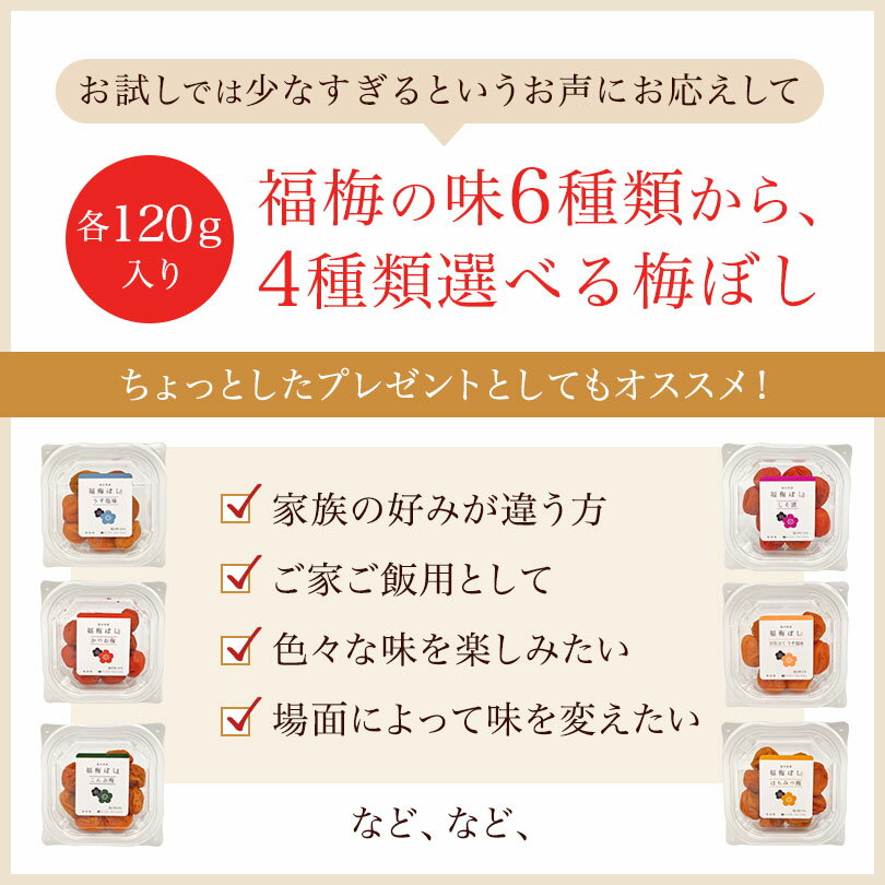 送料無料 梅ぼし生活 選べる組合せ 福梅ぼし梅干し食べ比べセット各120gx4味 うす塩 無添加しそ漬 はちみつ 昆布 かつお 甘仕立てうす塩味/食べ比べ/ご飯のお供/酸っぱい/福井県産紅映梅/国産 お取り寄せ グルメ