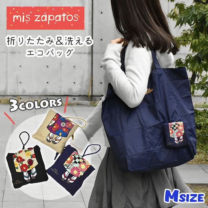 mis zapatos ミスサパト 着物 エコバッグ Mサイズ /レディース 女性 女子 エコバック トートバッグ 折りたたみ 折り畳み 簡単 洗える 洗濯 大きい 大きめ 大容量 A4 大 L 旅行 肩がけ 肩掛け マチ マチ広 サブバッグ おしゃれ オシャレ 可愛い かわいい 撥水 ナイロン/