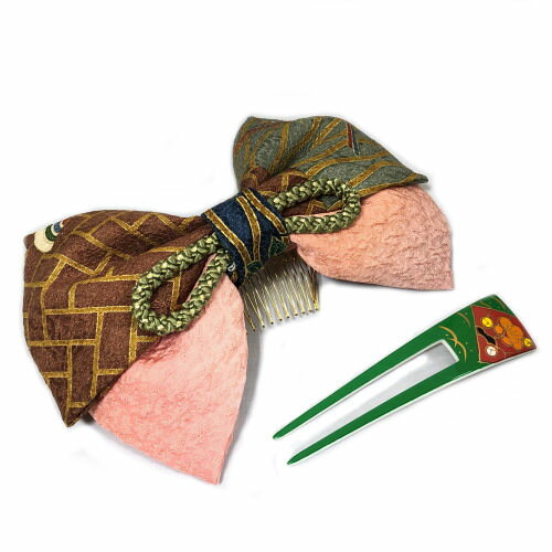 古典柄のちりめん生地が上品に演出してくれるヘアコームとかんざしのセットです。