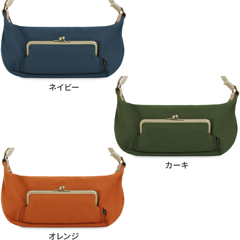 マウンテンパーカーなどでおなじみの機能素材、ロクヨンクロスを使った、ほんのりバナナ型のボディにメイン収納がファスナー仕様の、くし型がま口ポケット付きショルダーバッグです。